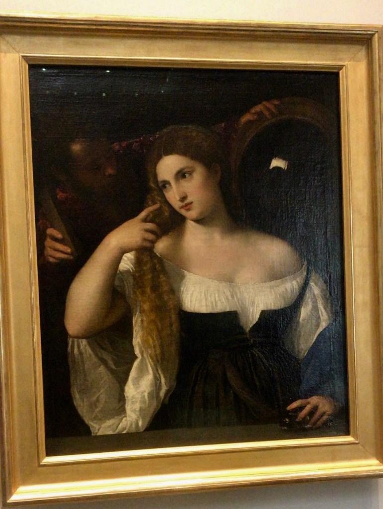 The artist Titan had several attempts of drawing to identify the main female figures. The same women drawn in Woman with a Mirror has been drawn in different pictures such as the Flora at the Uffizi, The gallery of Prague castle the MNAC of Barcelona and the National Gallery of Art in Washington has many versions of Titan’s drawings which are equal to the quality but with different size.
